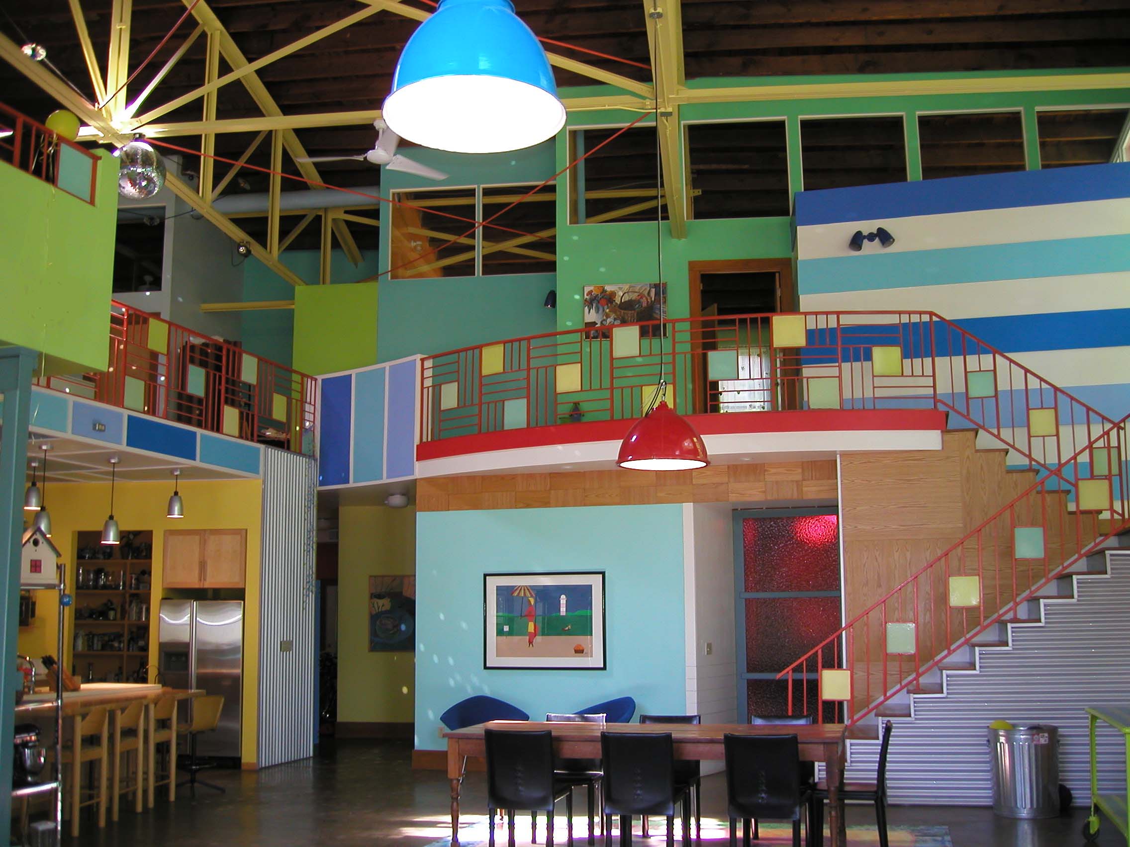 The remainder of this 18,000 Sq Ft building was an open, clear-span warehouse with polished concrete floors. It had a 30-ft high, bowed wood ceiling, held up by a system of metal beams and girders. This eliminated the need for any other interior vertical supports. Before the build out of the warehouse area, the kids used this fabulous space for rollerblading.